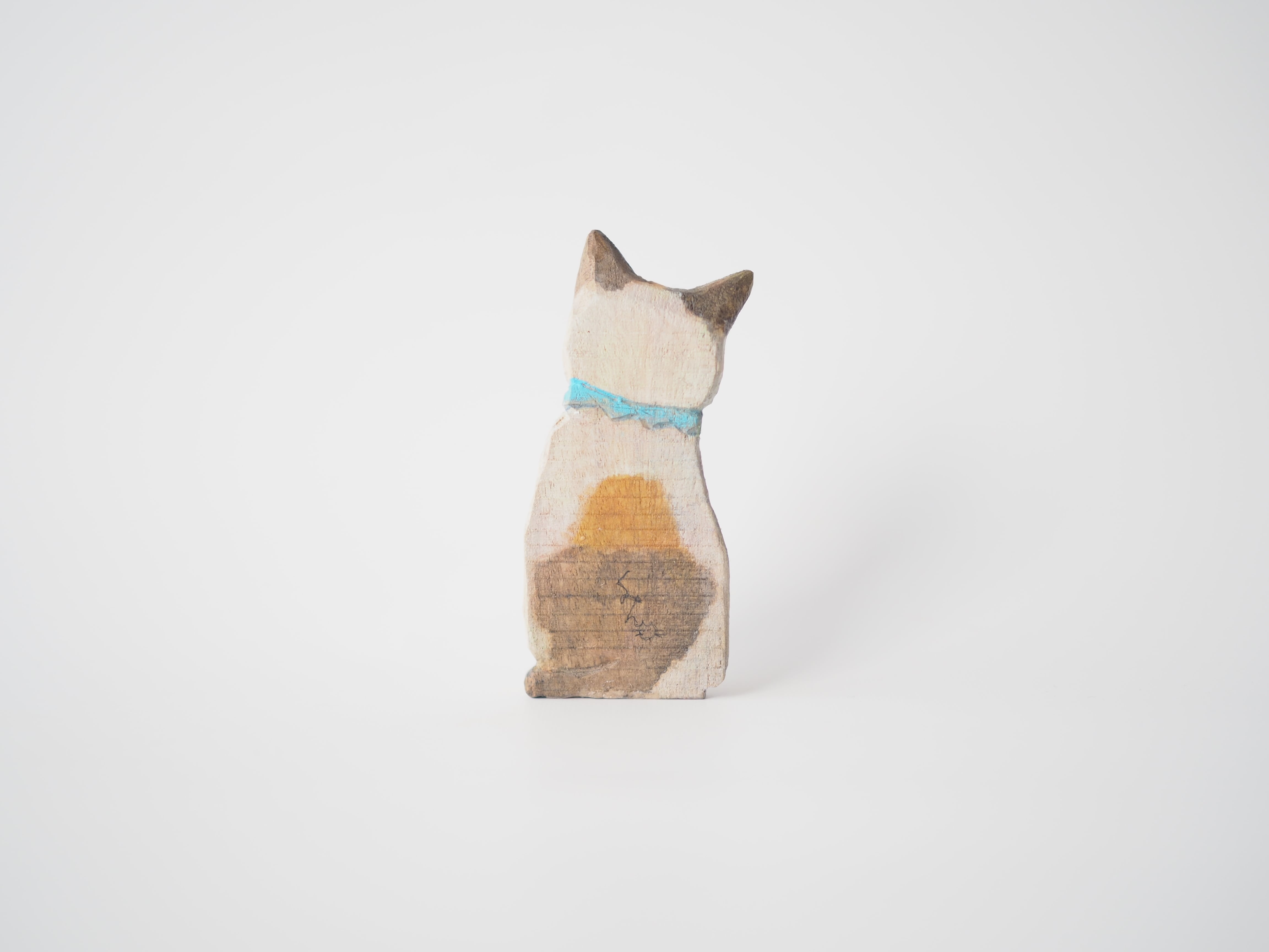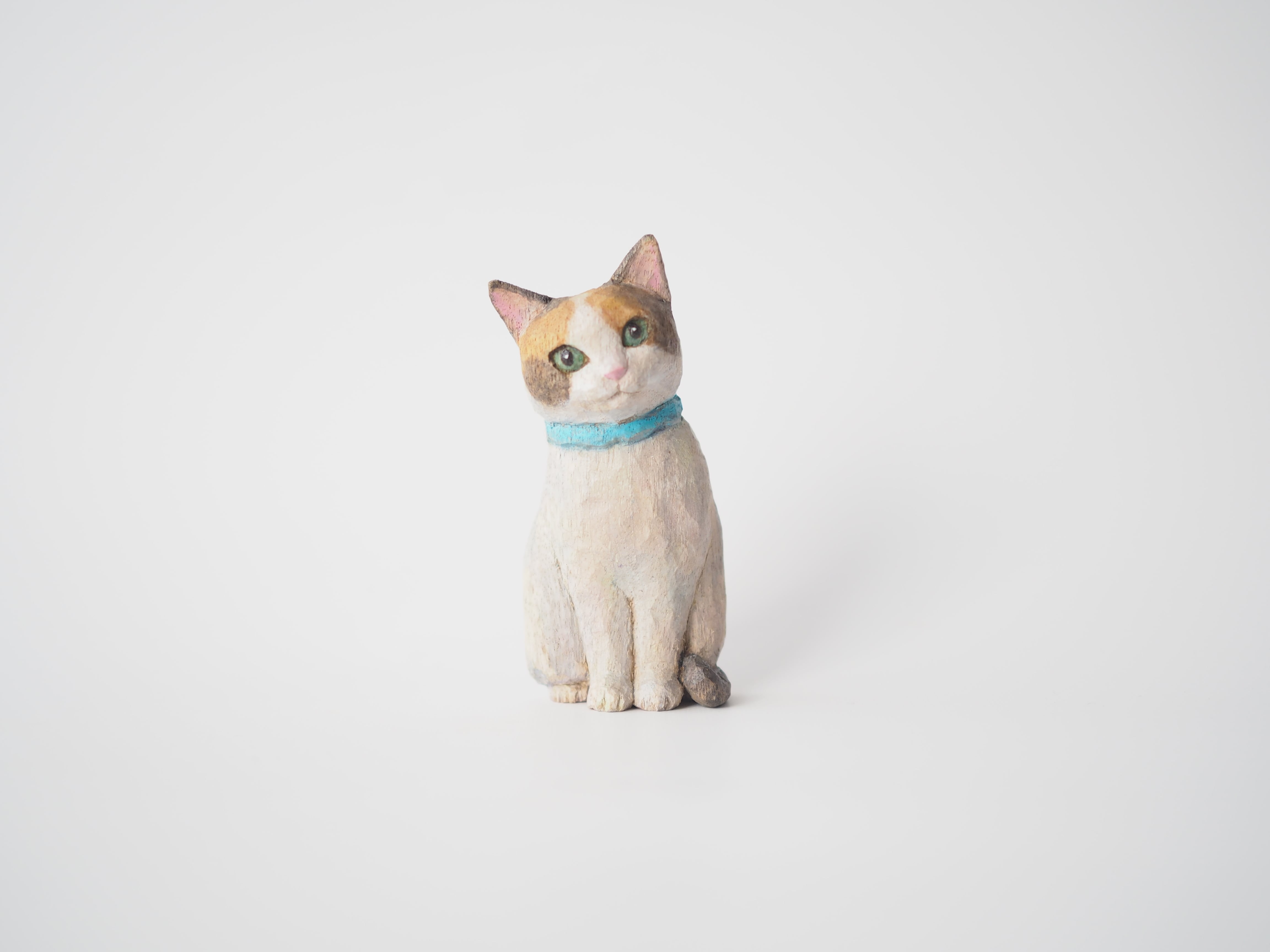 首輪シリーズの三毛猫さんです。水色の首輪を付けて少し首を傾げています。