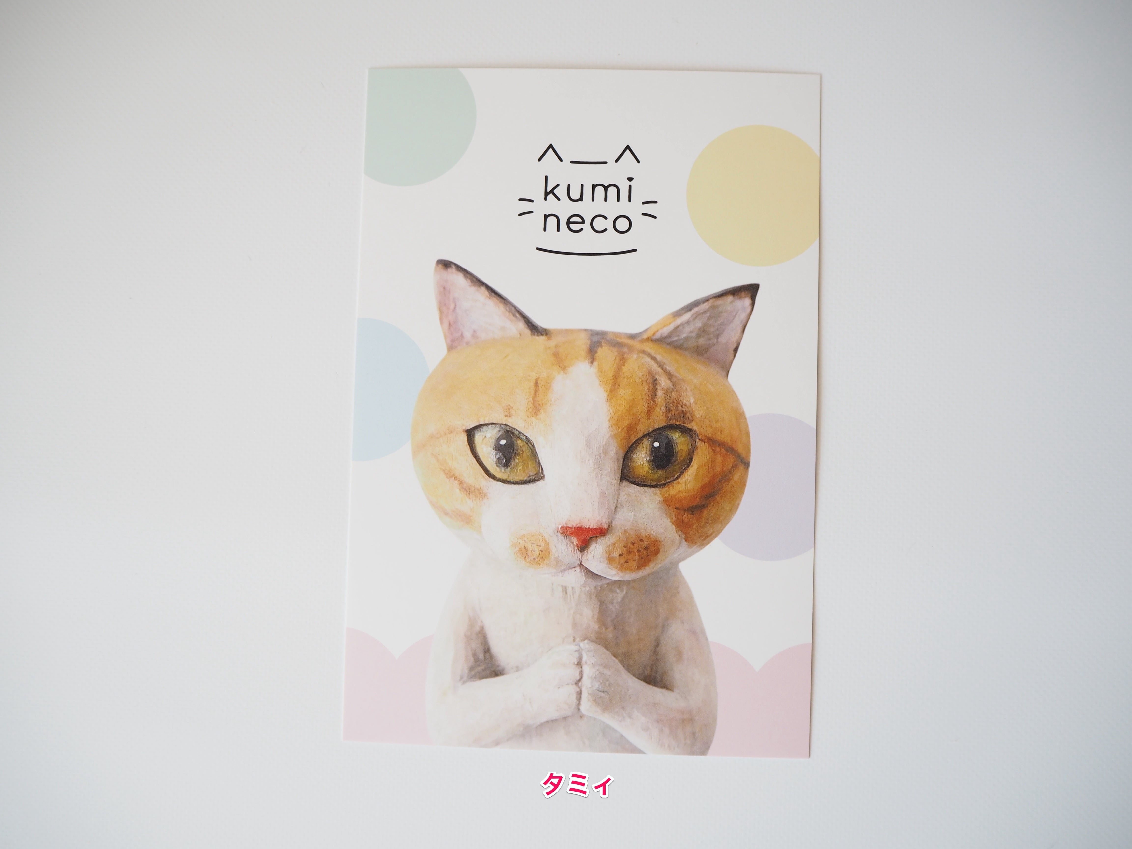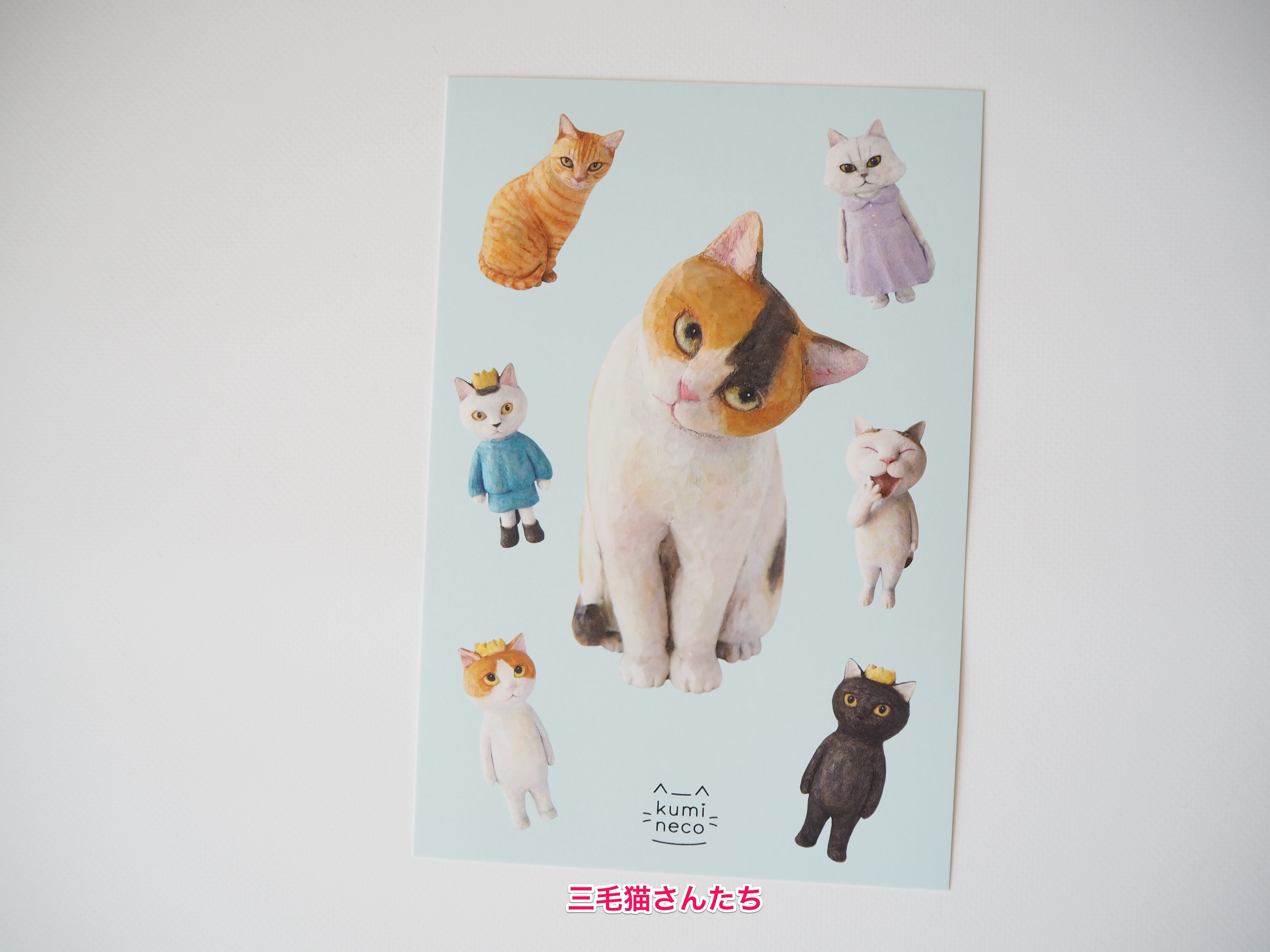 タミィ、くまたま、三毛猫さんたちの木彫りのポストカードです。
